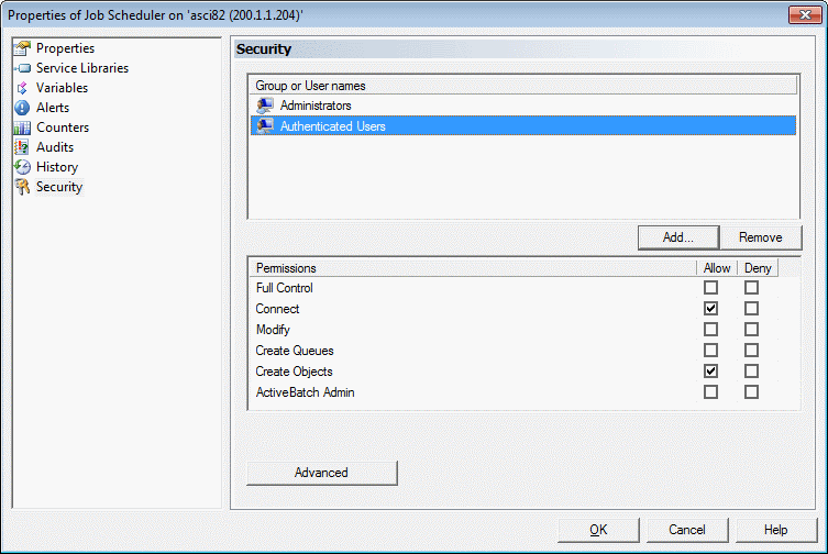 Every ActiveBatch object is fully securable. Every object has a Security property sheet, where security is configured. If Factory Default security is being used, the local Administrators group and the Authenticated Users group are added to the Security property sheet (when new objects are created), and default permissions for the two groups are applied.