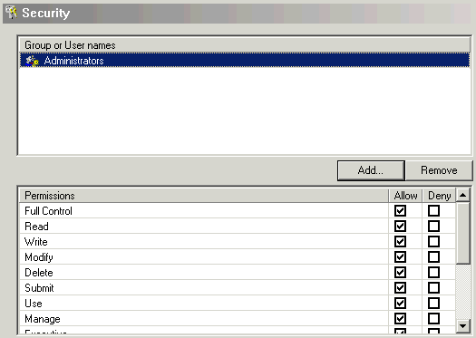 Similar to the Microsoft Windows security model, a security descriptor contains one or more groups and/or user names for the object. Access permissions are associated with the account/group. While some permissions are common to all objects, several are object specific. Permissions are broadly categorized as either Allow (Grant) or Deny.