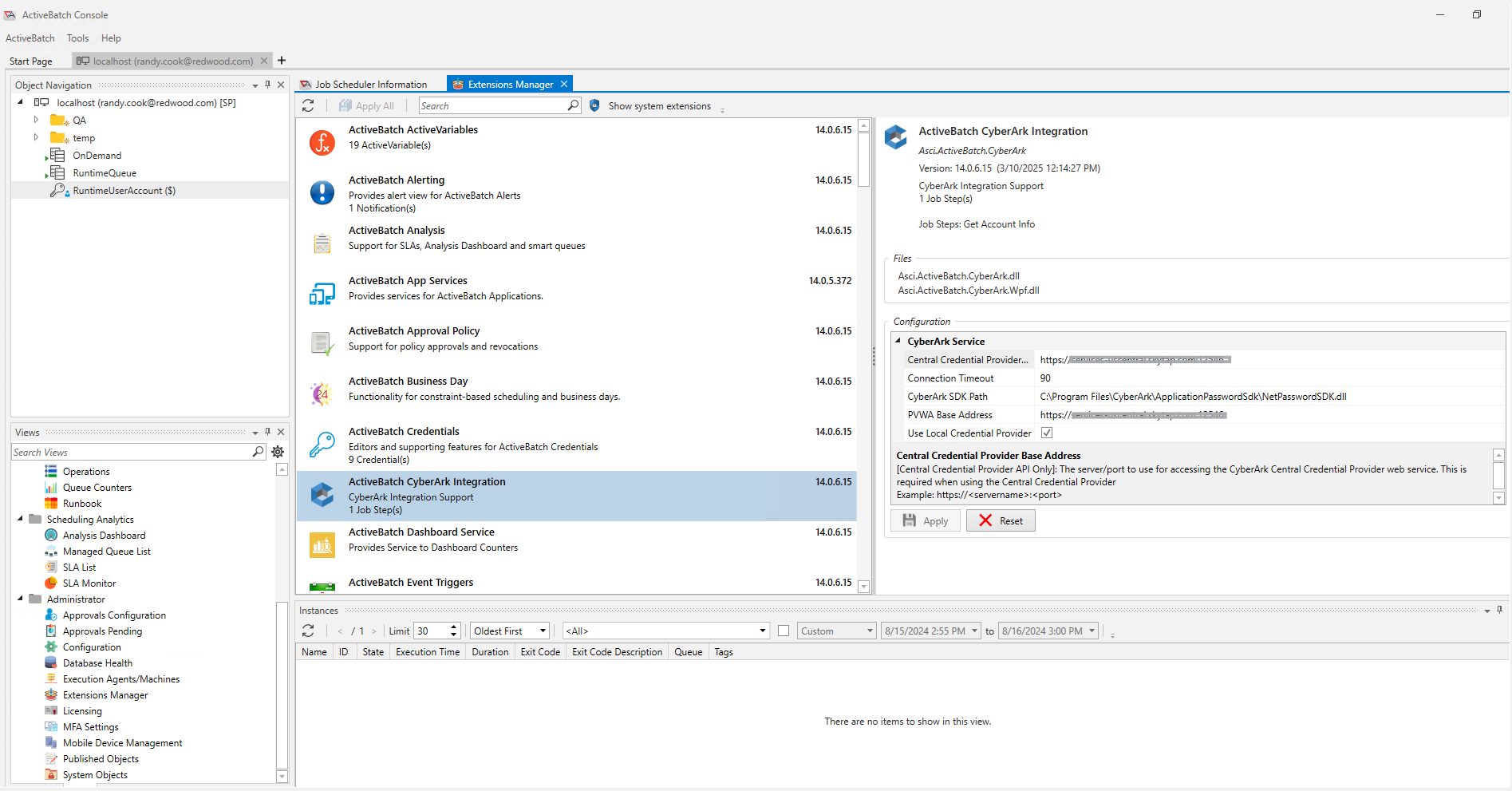 Configure the Extensions Manager in ActiveBatch Console to provide configuration information and the CyberArk Marketplace (ActiveBatch) for the Integration Guide.