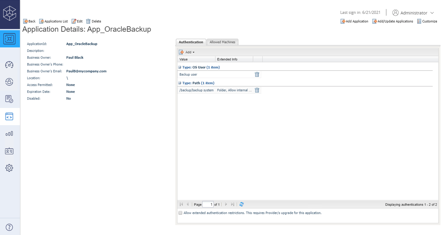 Application path | Specify the path where the application will run. To indicate that the specified path is a folder, select the Path is folder option. To enable internal scripts to retrieve the application password for this application, select the Allow internal scripts to request credentials on behalf of this application ID option. |