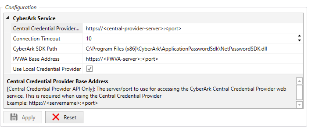 Central Credential Provider Base Address – This parameter specifies the servername and port number (https://servername:port) to use for accessing the CyberArk Central Credential Provider Web Service (REST). This is only required when using the Central Credential Provider.
