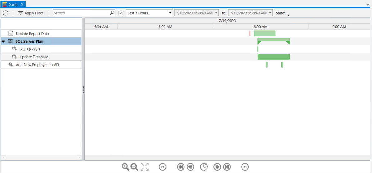 In the image below, Update Report Data ran twice during the 8:00 AM timeframe; the first time it failed (observe the red line). The second time it ran for a longer period of time and succeeded. Next, the SQL Server Plan consists of two Jobs, SQL Query 1 and Update Database. SQL Query 1 ran for a short period of time and succeeded. Update Database also succeeded, but it ran for a longer period of time. Lastly, the Add New Employee to AD Job ran twice in the 8:00 AM timeframe, and both instances succeeded.